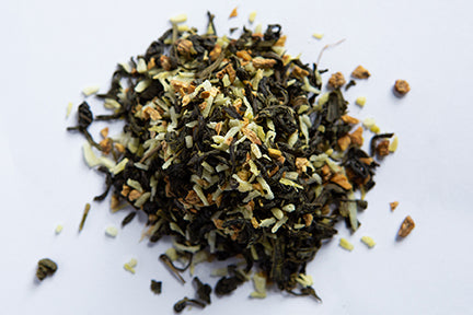A tropical inspired Green Tea with Coconut, Ginger and a hint of Vanilla sweetness. Wonderful hot, it makes a relaxing iced tea, perfect for sipping at the beach or in a hammock!